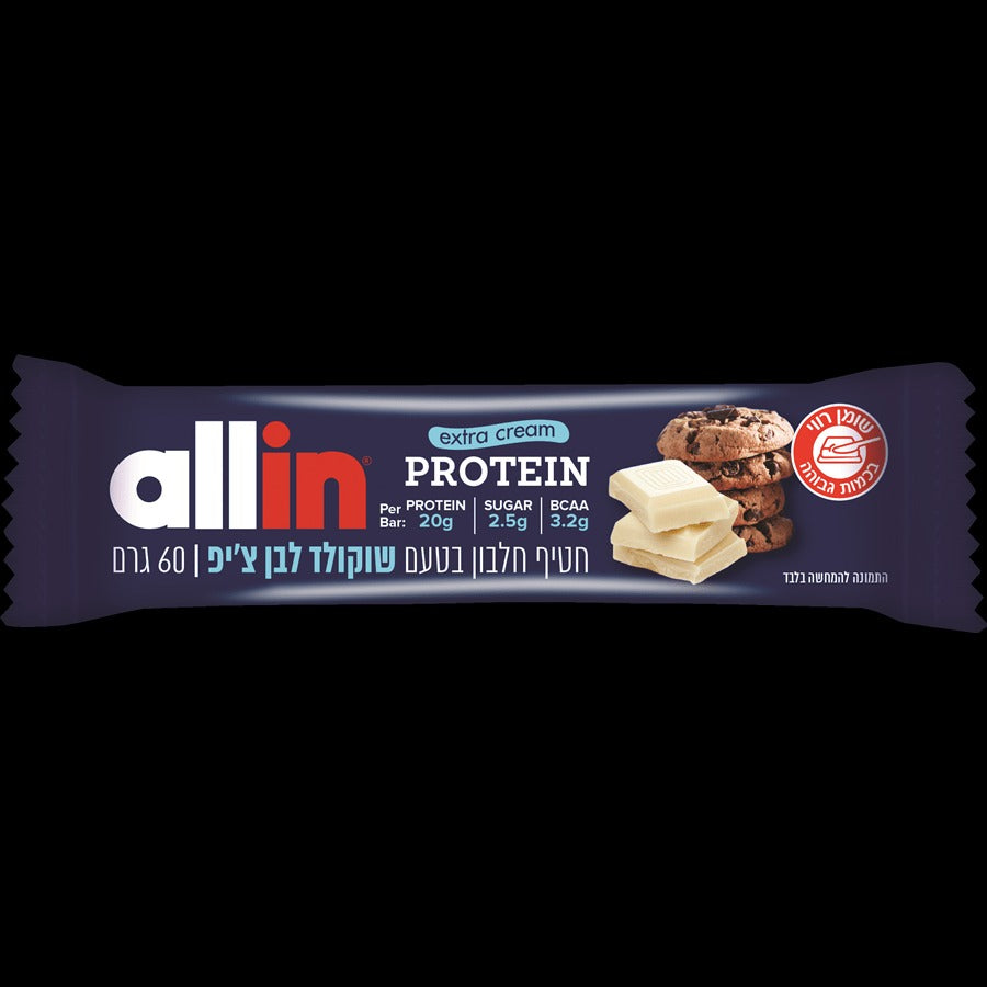 חטיף חלבון בטעם שוקולד לבן צ'יפ מבית ALLIN הוא תוספת מצוינת לתפריט התזונתי שלך. מלא בטעמים עשירים, הוא מכיל כ-20 גרם חלבון איכותי ממקורות כגון חלבון מי גבינה, ומצטיין בשכבת קרם מפנקת ושכבת קראנצ' שוקולדי. החטיף עם תכולת סוכר נמוכה של רק 2.5 גרם, מאפשר לך ליהנות מחווית טעם מענגת מבלי להרגיש רגשות אשמה!