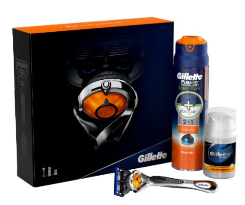 המארז כולל מכונת גילוח ארגונומית בצבע כחול-כתום, ג'ל גילוח לעור רגיש וספריי לאחר גילוח לשמירה על עור הפנים. הקופסה מעוצבת בצורה מודרנית עם צבעים כהים ומושכים.