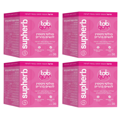 tab in gum (טאב אין גאם) - מולטי ויטמין לנשים בהריון - 30 טבליות בציפוי גומי לעיסה בטעם דובדבן ענבים - ללא תוספת סוכר - 2 דקות לעיסה - מבית סופהרב - אריזת רביעיה