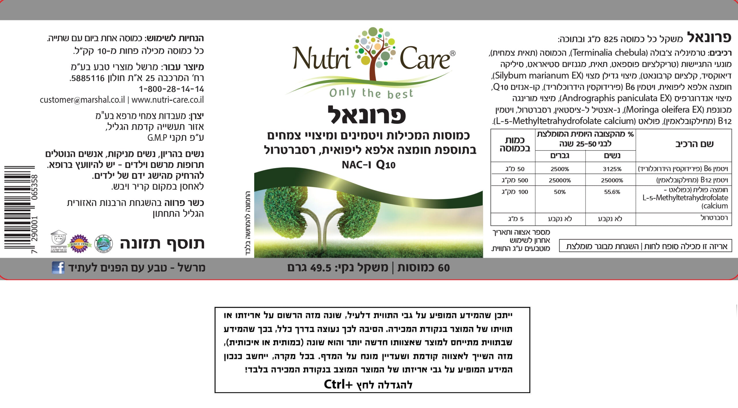 פרונאל (Pronal) - 60 כמוסות המכילות ויטמינים ומיצוי צמחים בתוספת חומצה אלפא ליפואית, רסברטרול Q10 (קיו 10) ו-NAC (אן אי סי) - מבית נוטרי קר