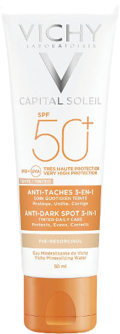 קרם הגנה לפנים עם גוון SPF50, המעניק הגנה גבוהה מאוד מפני קרני UVB ו-UVA, תוך כדי שמירה על גוון עור אחיד ומניעת כתמים כהים.