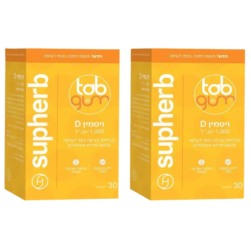 ויטמין D | טאב אין גאם | ויטמין D במינון 1000 יחב"ל | מבצע זוג | טבליות בציפוי גומי לעיסה | בטעם פירות אקזוטיים | מכיל 30 יחידות | מבית סופהרב סופהרב | SUPHERB |