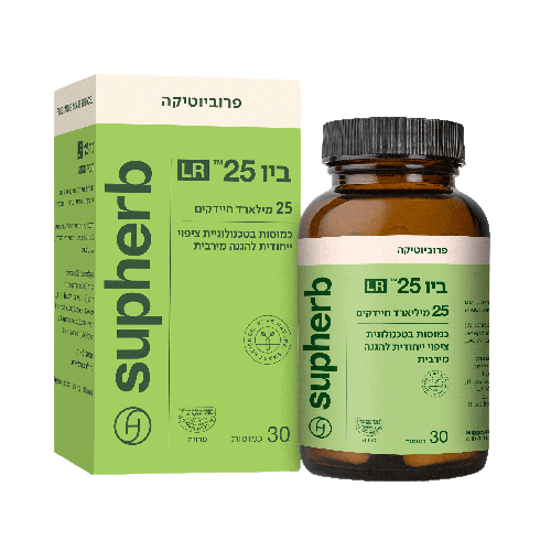 תוסף תזונה "LR™ 25" של המותג "Super Herb" הוא פורמולה טבעית המשלבת 8 זנים שונים של חיידקים פרוביוטיים. כל כמוסה מכילה לפחות 25 מיליארד חיידקים פרוביוטיים, כולל את החיידק הפוטנטי Lactobacillus Reuteri, הידוע ביעילותו בתחום העיכול.
