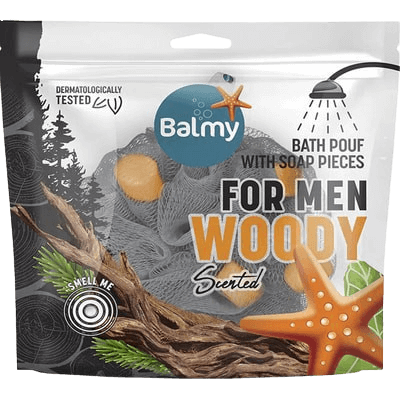 ליפה עם חתיכות סבון | לופה רחצה לגברים – ניחוח עצי | בלמי | Balmy | Bath Pouf with Soap Pieces | For Man | Woody ליפה עם חתיכות סבון | לופה רחצה לגברים – ניחוח עצי | בלמי | Balmy | Bath Pouf with Soap Pieces | For Man | Woody