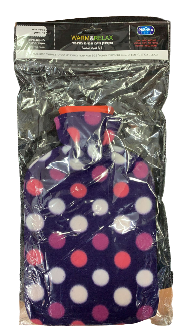 בקבוק מים חמים מרופד מבית פארמה קר, מיועד לחימום פינוק והקלה על כאבים. הבקבוק עשוי מפוליאסטר רך ונעים עם נקודות צבעוניות.