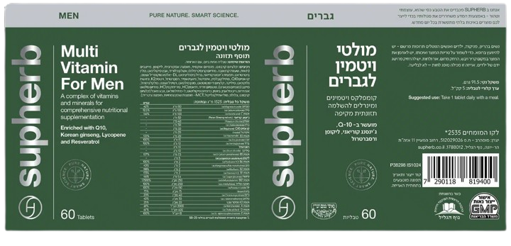 מולטי ויטמין לגברים | קומפלקס ויטמינים ומינירלים | מועשר Q10 | מכיל 60 טבליות |