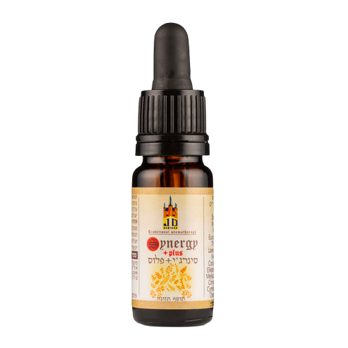 בקבוקון קטן עם טפטפת, כנראה שמן רפואי, בעיצוב זכוכית כהה. התווית נושאת את השם 'Synergy Plus' ומיועדת לרווחה ובריאות, מכילה 10 מ