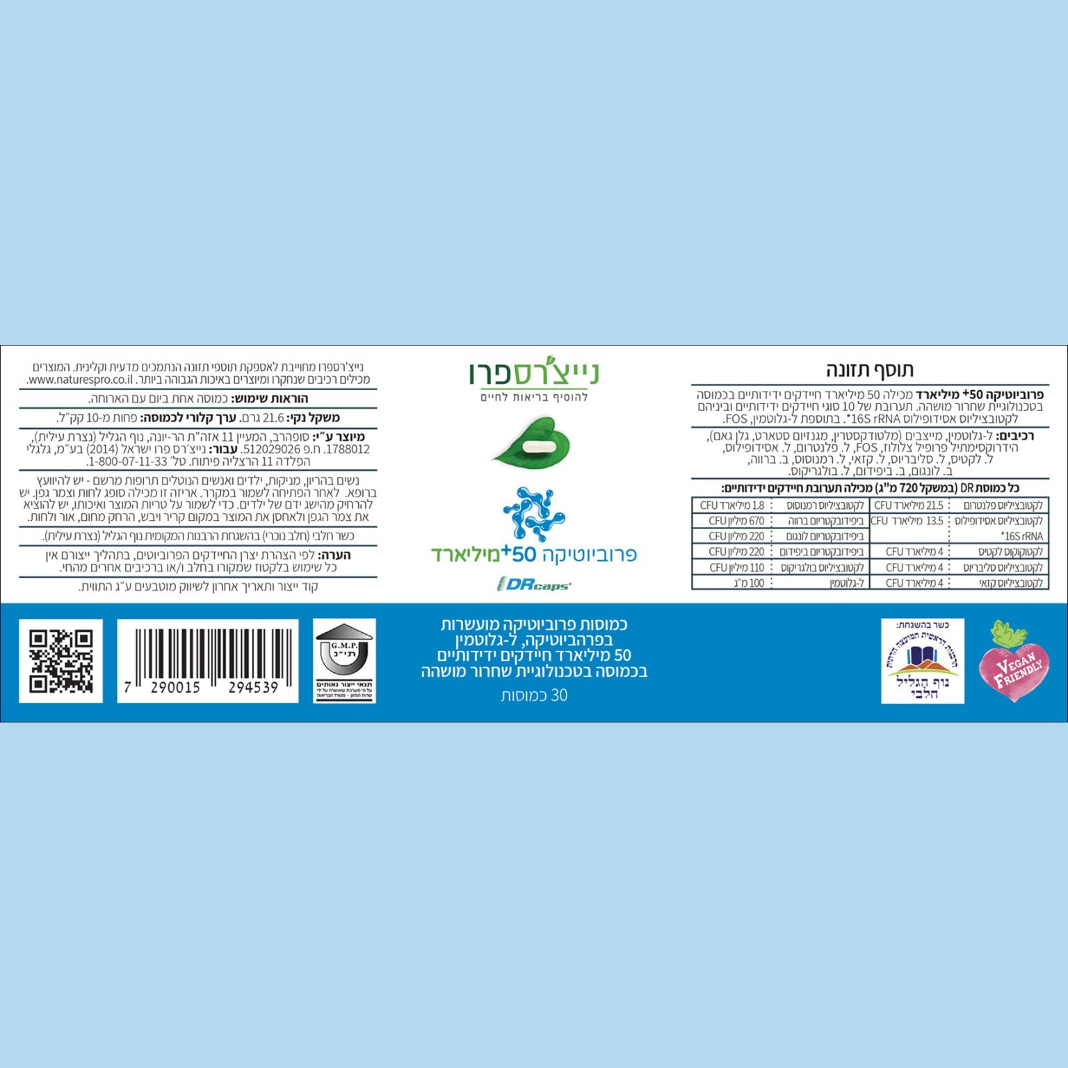 הערה: לפי הצהרת יצרן החידקים הפרוביוטים, בתהליך ייצורם אין כל שימוש בלקטוז שמקורו בחלב ו או ברכיבים אחרים מהחי.