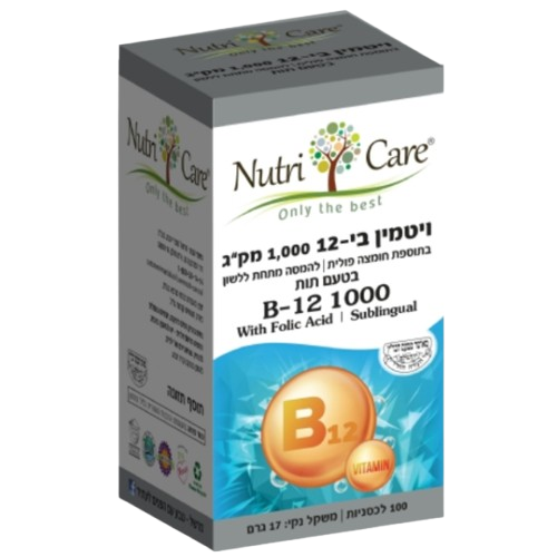 המוצר "B-12 1000 With Folic Acid" של Nutri Care מיועד לסייע בהשלמת מחסורים בוויטמין B12 וחומצה פולית, מרכיבים חיוניים לצמיחה ולהתפתחות תקינה, במיוחד בתחילת ההריון.