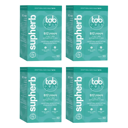 מבצע רביעייה -טאב אין גאם ויטמין B12 בצורת מתילקובלמין | במינון 1000 מק"ג-גומי לעיסה - בטעם דובדבן ענבים - מכיל 30 יחידות - מבית סופהרב