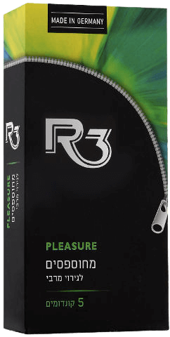 R3 PLEASURE: קונדומים מחוספסים לגירוי מירבי, משומנים בחומר סיכוך מעולה ומיוצרים בגרמניה. עשויים מגומי טבעי (לטקס), ים במניעת היריון ובהקטנת הסיכון להידבקות במחלות מין. מיועדים לשימוש חד פעמי. 5 קונדומים באריזה.