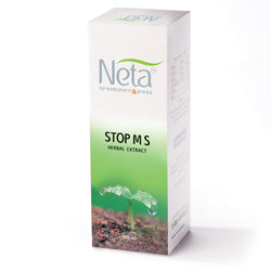 תמצית צמחית 'STOP M S' של המותג Neta, באריזת קופסה ירוקה עם רקע של צמח צעיר.