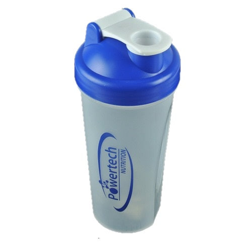 שייקר ספיידר בצבע שקוף-אפור עם מכסה כחול, כולל פיית מזיגה ומעוצב לאבקות חלבון. מותג: Powertech Nutrition.