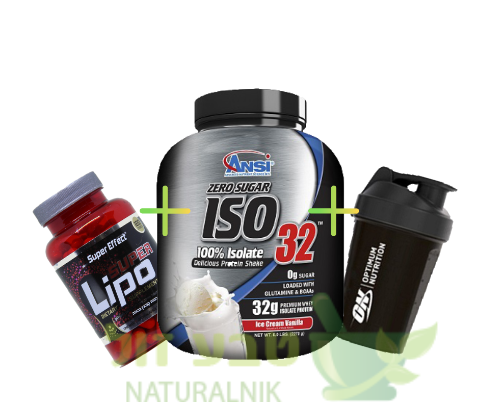 חבילת ספורט - אבקת חלבון- ISO 32 שוקולד + סופר ליפו 120 כמוסות + שייקר מקצועי