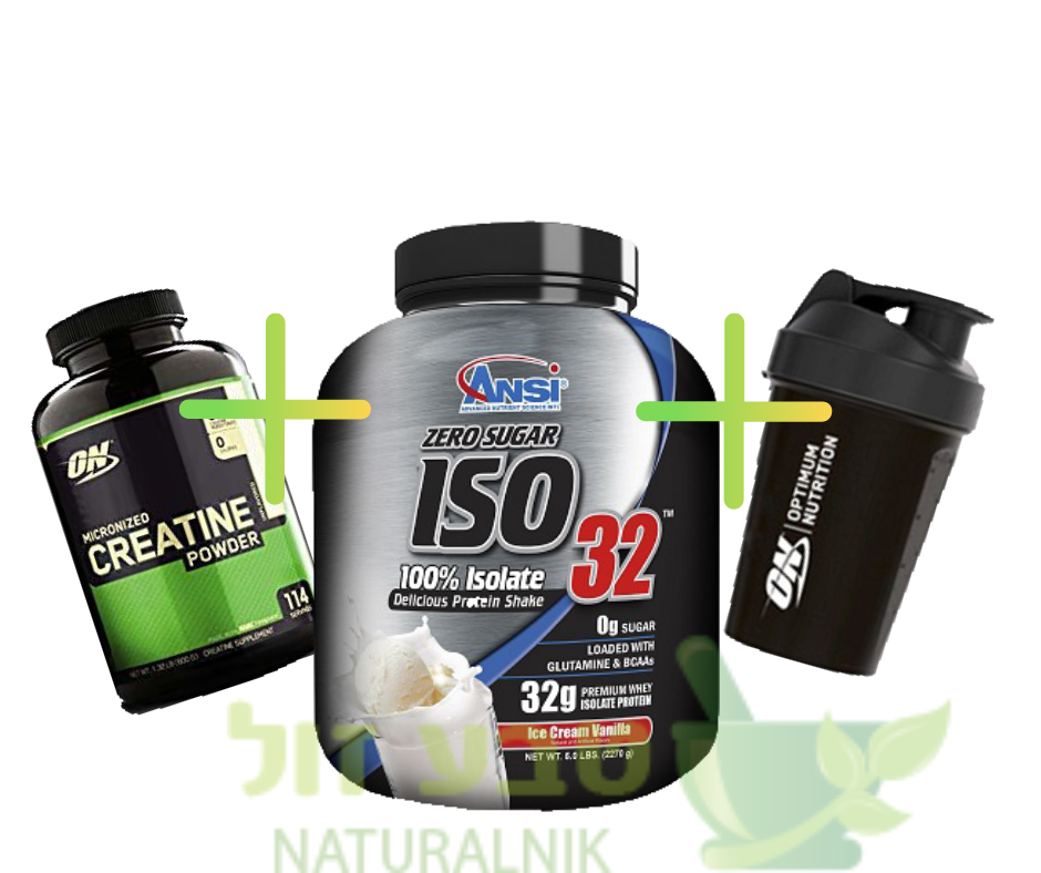 חבילת ספורט: אבקת חלבון ISOLATE, קראטין ושייקר מקצועי