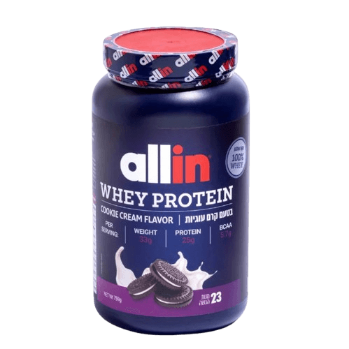 אבקת חלבון מי גבינה איכותית תוצרת בלגיה בטעם קרם עוגיות ׀ אם המטרה שהצבתם לעצמכם הינה חיזוק ובניית השרירים, אז אבקת החלבון מבית allin, הינה תוספי תזונה לספורטאים האידיאלית עבורכם לאימון. allin חלבון מי גבינה מותאם להשלים את צריכת החלבון הדרושה לגוף במצבים משתנים. לאחר הפעילות הגופנית יש צורך בהתאוששות מהירה של השריר ולחלבון יש תפקיד חשוב בכך. החלבון הינו המרכיב החיוני ביותר בבניית מסת השריר ואף להחלמה מפציעות ספורט. חלבון איכותי המכיל חלבון מי גבינה תוצרת בלגיה תקני איכות מחמירים ׀ מיוצר במפעל שעבר בהצלחה בדיקות לאיתור חומרים אסורים לשימוש על ידי ספורטאים אינו מכיל חלבון סויה מרקם וטעם מעולים גודל אריזה 759 גרם