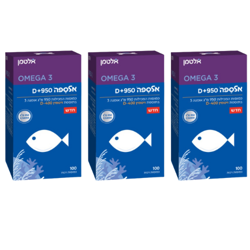 אלספה D+950 | אומגה 3 במינון גבוה במיוחד של 950 מ"ג | מכיל 300 כמוסות | מבצע שלישייה |
