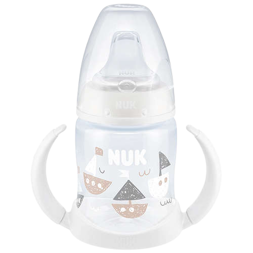 בקבוק אימון פיירסט צ'ויס NUK FIRST CHOICE-מכיל 150 מ"ל לגילאי 6-18 חודשים -צבע לבן