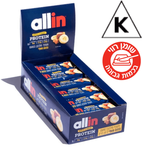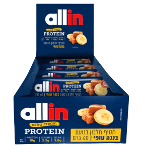 חטיף חלבון בטעם בננה טופי | משקל 60 גרם | 2.2 גרם סוכרים | 18 גרם חלבון | מכיל 2.8 גרם חומצות אמינו מסועפות | Extra Cream | אריזת 24 יחידות | מבית אול אין