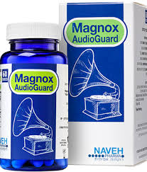 בקבוק כחול של תוסף תזונה 'Magnox AudioGuard' של נווה פארמה, המכיל 60 קפסולות. על הבקבוק מופיעה איור של תקליט רדיו.