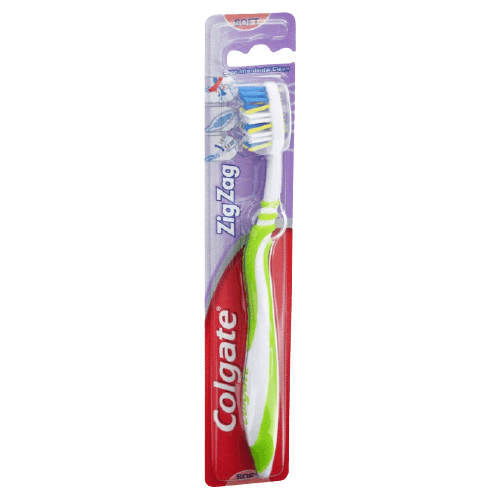 מברשת שיניים ZigZag של קולגייט, בצבעים לבן, ירוק וכחול, בעלת סיבים רכים ומסודרים בזווית למקסום הניקוי בין השיניים. ידית קעורה לנוחות אחיזה.