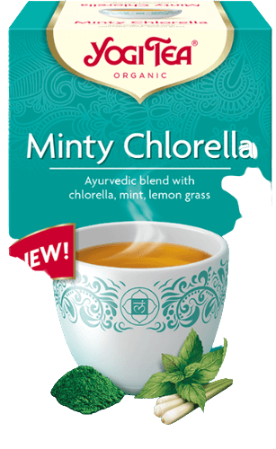 תה אורגני "Minty Chlorella" ממותג Yogi Tea, משלב תערובת איורוודית עם כלורלה, מנטה ומריש לימון. תה זה מציע חוויה מרעננת ומתקתקה, מושלם להכנת משקה בחליטה.