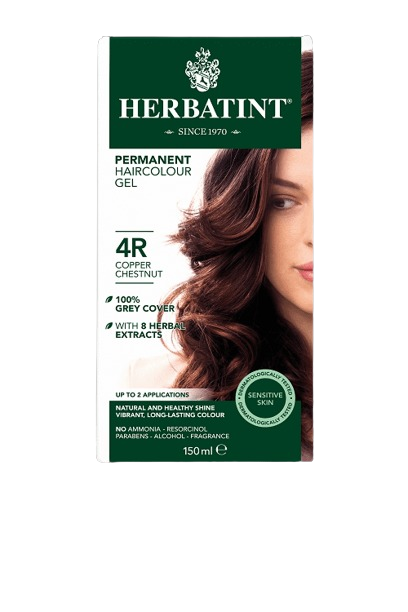 צבע שיער קבוע מבית HERBATINT בגוון 4R - נחושת ערמוני, מיוצר מרכיבים טבעיים ועשיר בתמציות צמחיות שנותנות זמינות ומניעת נזק לשיער.