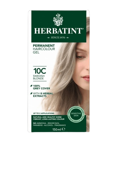 צבע שיער קבוע HERBATINT בגוון 10C (בלונד שוודי) הוא צבע קל לשימוש ועדין לשיער. צבע זה מבטיח כיסוי מלא לשיער אפור ומיוצר על בסיס צמחי בלבד.