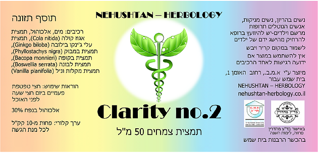 תמצית צמחית "Clarity no.2" מבית "Nehushtan - Herbology" מכילה רכיבים טבעיים שמטרתם לשפר את הריכוז והעירנות. הפורמולה פועלת משני מישורים: מחזקת את פעילות המוח ותומכת בתהליכי החשיבה והזיכרון.