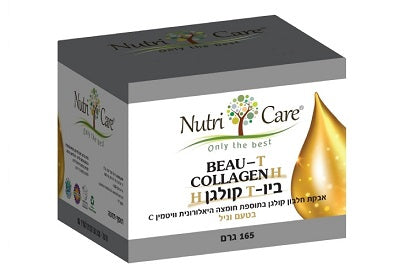 ביו-טי קולגן-אייץ (BEAU-T COLLAGEN H) - מכיל 165 גרם אבקת חלבון קולגן פפטידי בתוספת חומצה היאלורונית וויטמין סי (C) - בטעם וניל - מבית נוטרי קר