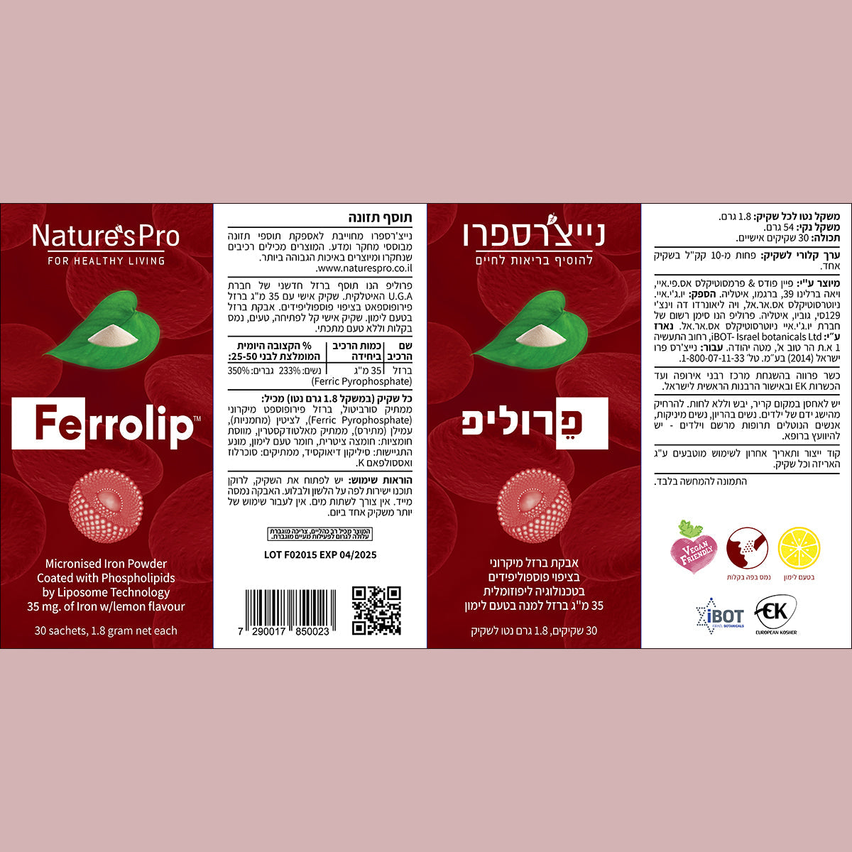 פרוליפ אבקת ברזל מיקרוני בטכנולוגיה ליפוזומלית- 35 מ"ג ברזל למנה בטעם לימון - מכיל 30 שקיקים - נייצ'רס פרו