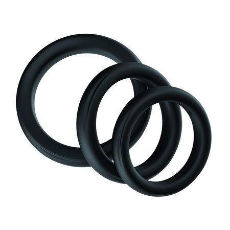 סט של 3 טבעות סיליקון שחורות, גמישות ועבות, בעלות גימור חלק ועיצובים עם עקומות רכות. טבעות אלו מיועדות ל זקפה ודימוי עצמי, מתאימות לכל מצב ולחץ.