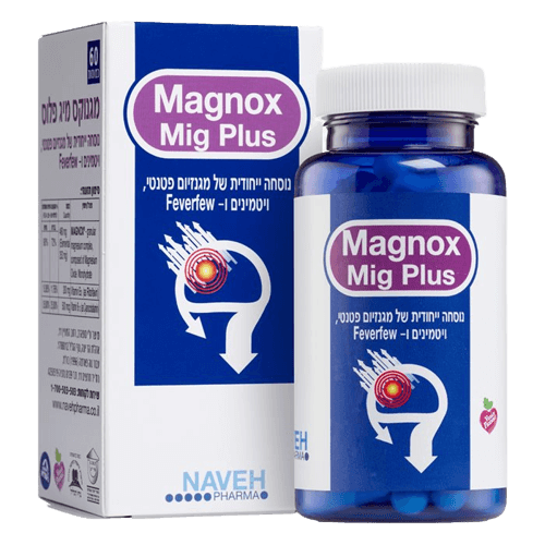 מגנוקס מיג פלוס | נוסחה ייחודית | מגנזיום פטנטי | ויטמינים | פיבירפיו | מכיל 60 כמוסות | Magnox Mig Plus | נוה פארמה