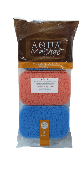 סט של 3 ספוגי מקלחת/מסאז' AQUA Massage, בצבעים אדום וכחול, באריזת שקית שקופה. המוצר ללא פרבנים.