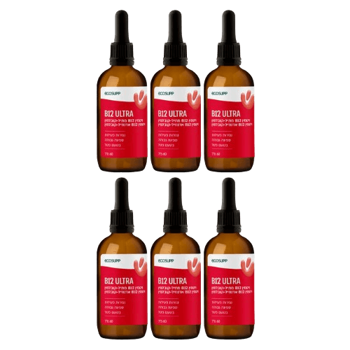 B12 ULTRA (בי12 אולטרה) - 60 מ"ל ויטמין בי12 מתיל-קובלמין, ויטמין בי12 אדנוזיל-קובלמין בטעם פטל - בעל ספיגה גבוהה ונגזרות פעילות - מבית אקוסאפ - אריזת שישיה